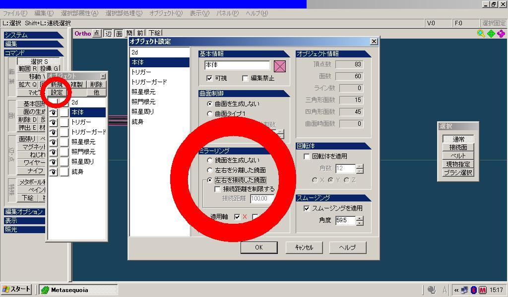 本体を選択し、「設定」を押して「オブジェクト設定」を開きます。