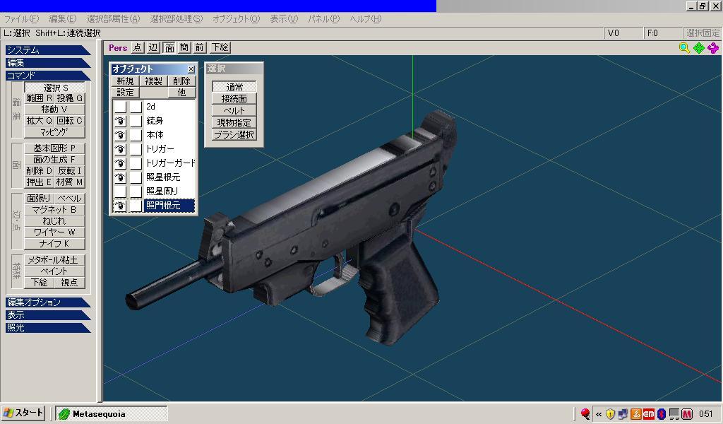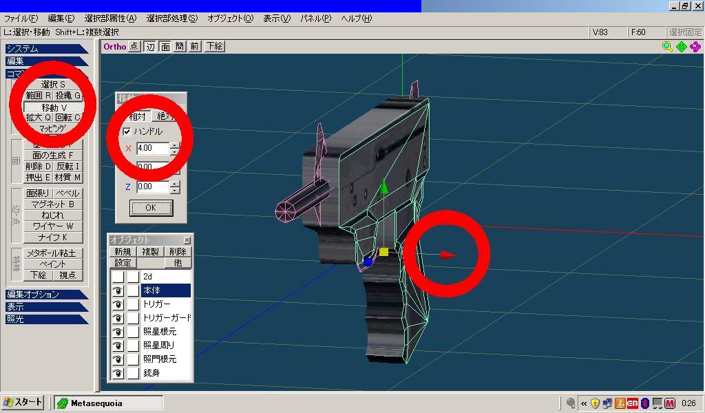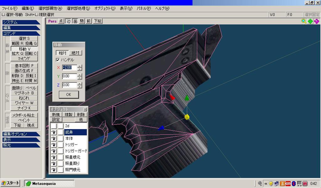 「トリガー」「トリガーガード」「照星根元」「照門根元」も同様に面を移動させて立体的にさせます。